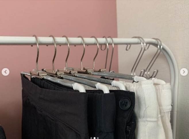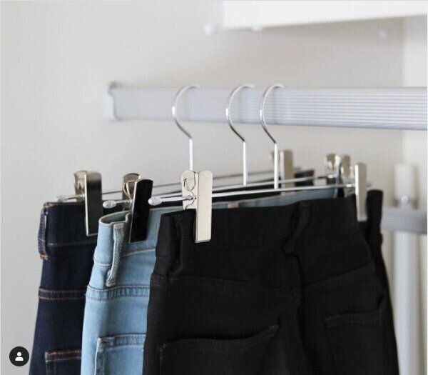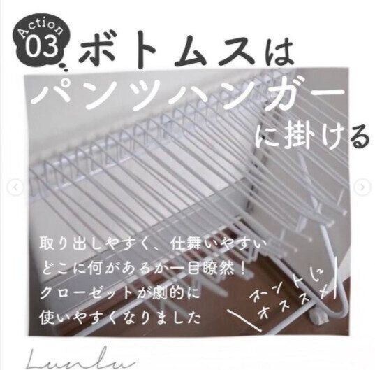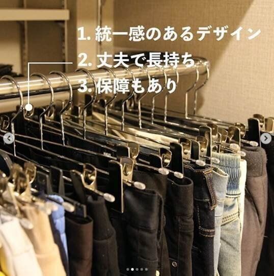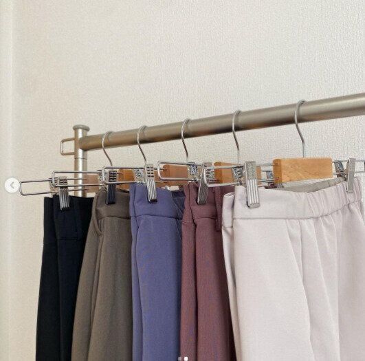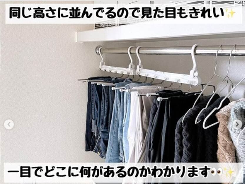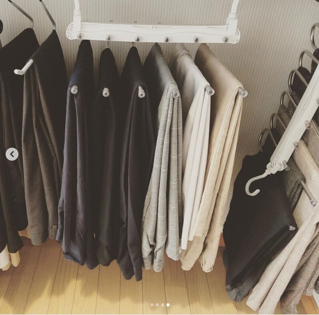 ハンガーを統一したのに、なんかスッキリしない…?と感じたら、パンツをかける向きに注目。ファスナーを向ける方向でパンツの高さが変わってしまうので、かけ方を統一するのがポイントなんだそうです。クローゼット全体を見てラインがそろうように調整してみてくださいね!