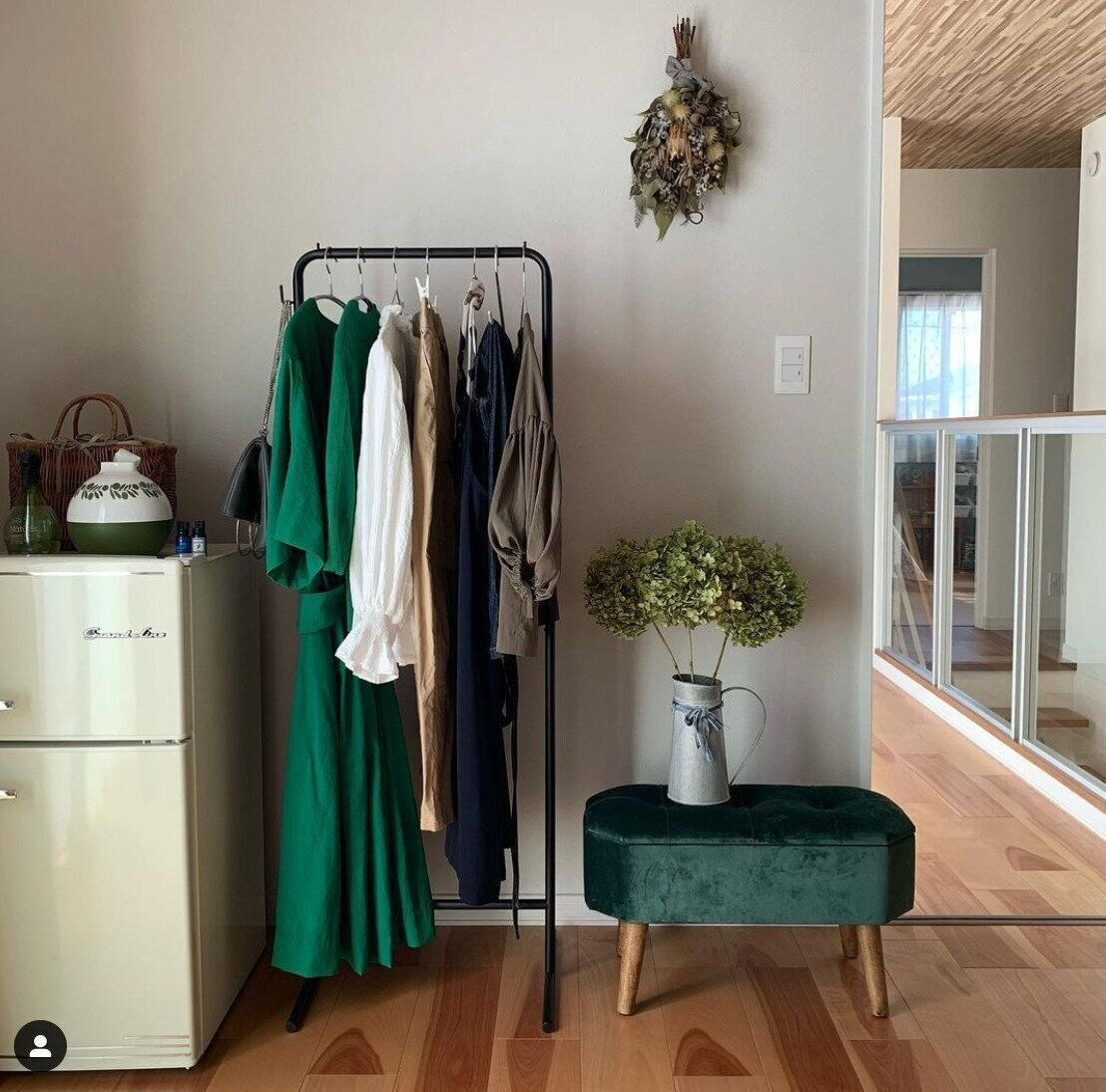 季節や気温の変化に合わせて、お気に入りの洋服を飾るように収納するのも素敵なアイデアです。植物やインテリアとの配色、雰囲気を合わせると、心落ち着く素敵な空間になります。