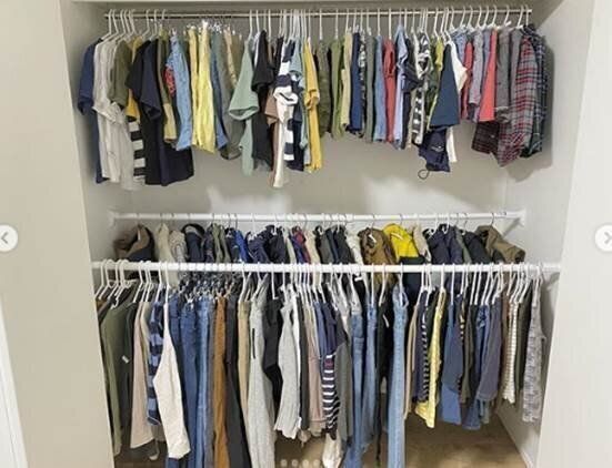 こちらはニトリの「2段に掛けられる吊り下げハンガー」を活用して収納スペースをつくっているケースです。服が2段にかけられるので、シンプルに収納力も2倍。お値段も1,017円とお手ごろなのがよいですね。