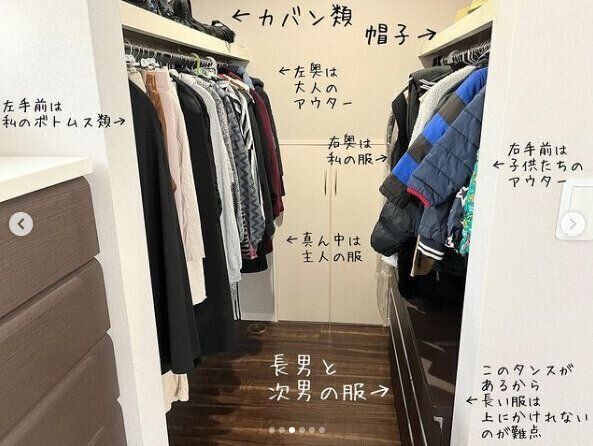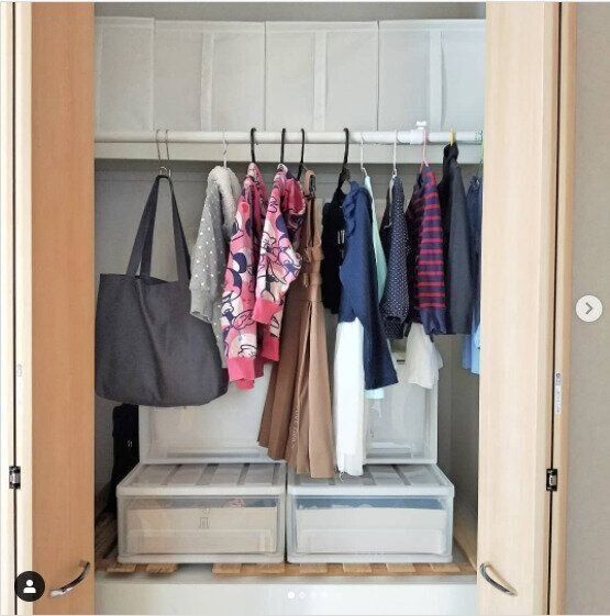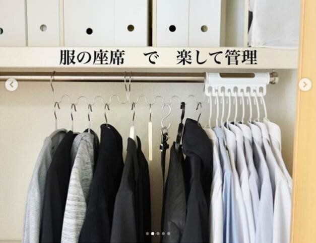 手持ちの洋服もすべてハンガー収納にすると管理も楽に。あまり着る機会のない礼服やシーズンオフの服はハンガーごと奥へ移動、シーズンが来たら手前に移動するだけ。衣替えも圧倒的に楽になりますね。