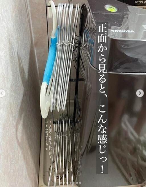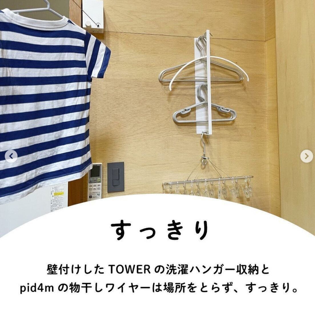 ハンガーそのものの収納アイデアがこちらです。タワーの「マグネット洗濯ハンガー収納ラック」を使ってデッドスペースにハンガーを収納しました。この場所にあれば、洗濯が終わった服をさっとかけることができ、しかも邪魔になりません。