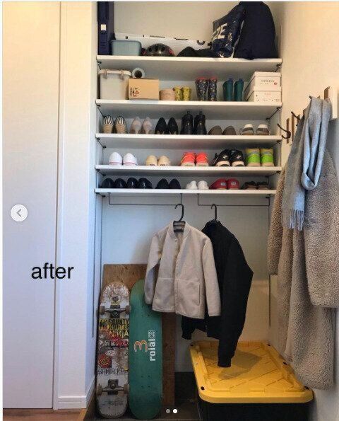 ジャケットやコートなどの上着類は部屋に持ち込まず、玄関先に置いておくとより便利になります。シューズクロークにセリアのアイアンバーをつければ簡易のハンガーラックがつくれ、上着類をすっきりかけておくことができます。