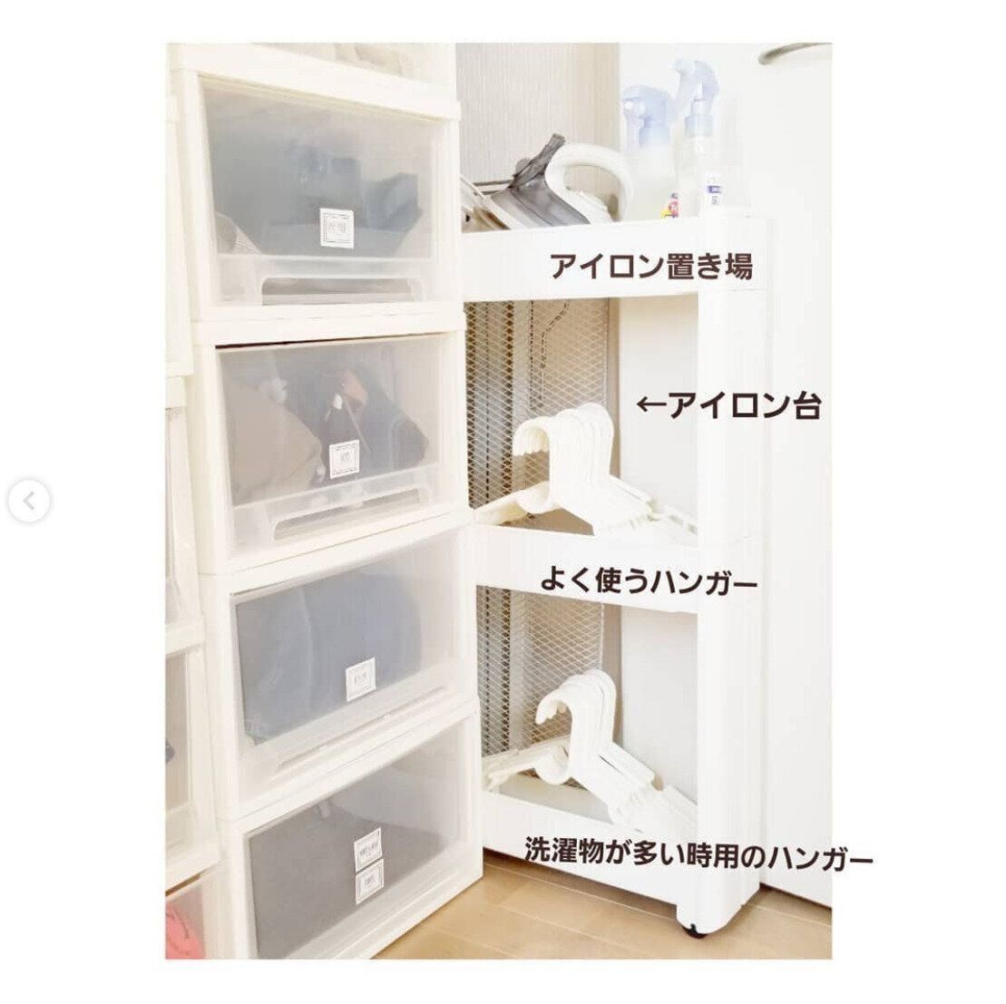 脱衣所まわりの隙間スペースなど、空いている箇所にぴったりのキャスターつき収納ケースを取り入れるのもおすすめです。ハンガーやアイロンなど、よく使うものをまとめておくと使い勝手もいいですよ。