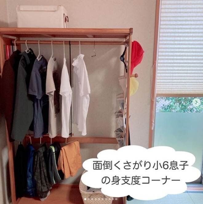 子ども服こそハンガー収納がおすすめ。こちらは小学生の息子さんの身支度コーナー。服の数を厳選し、ハンガーは引っ張ればスルッと取れるシンプルなものにしたそうです。下段のボトムスは、ひもとつっぱり棒でつくった自作のブランコハンガーにかけて。子ども用の小さな服は下のスペースが空くことが多いのでこれはいいですね!