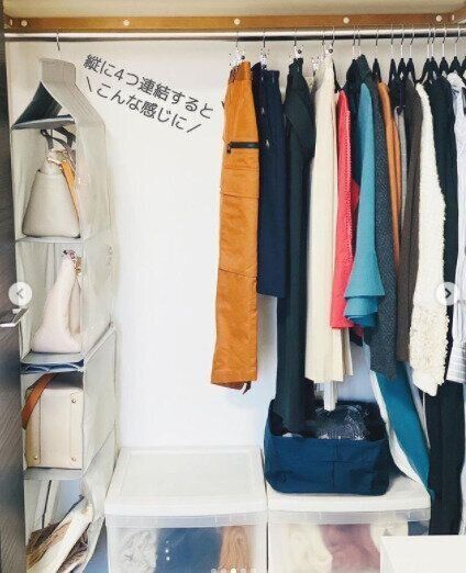 ハンガー収納は、衣服だけではなくバッグなどの小物収納もできます。バッグ収納に役立つのは、ダイソーで販売されている「バッグ収納ハンガー」。これひとつにいくつものバッグを引っかけて収納することが可能です。バッグの収納に悩んでいる人は、ぜひ参考にしてみてくださいね。