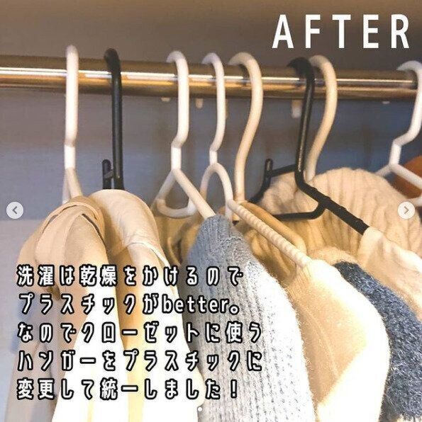 洗濯時のハンガーとクローゼット内のハンガーを統一することで、洗濯後のハンガーをかけ替える手間がなくなりストレスフリーになります。プラスチック性にすることでぬれた衣類をかけることができ、値段も安く統一しやすくなります。