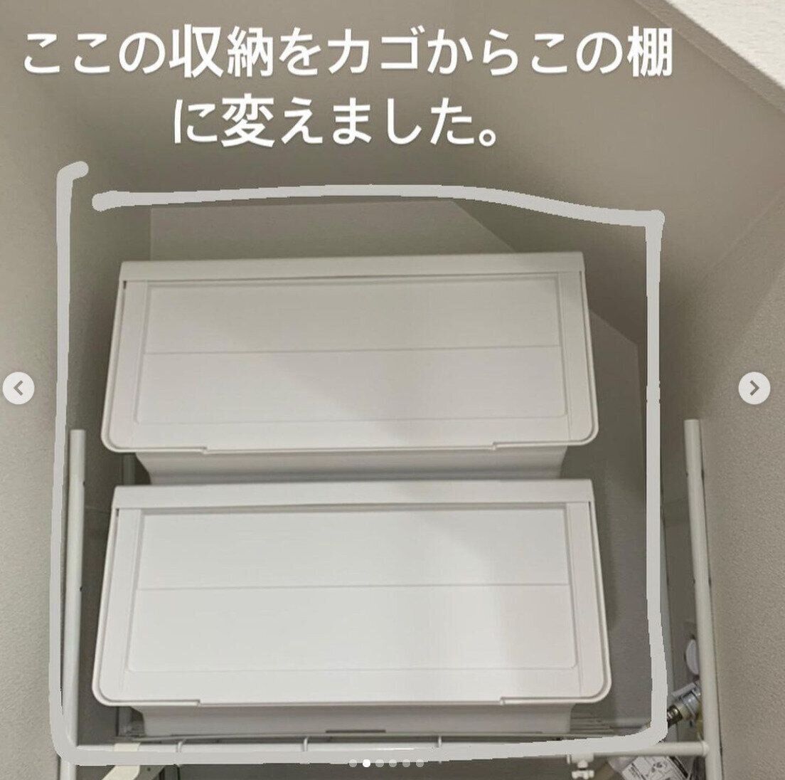 洗濯機上に、このようなシンプルな開閉タイプの収納ケースを設置すると、ものを落とさず出し入れも簡単に。カゴよりもたくさん入って見た目もスッキリします。