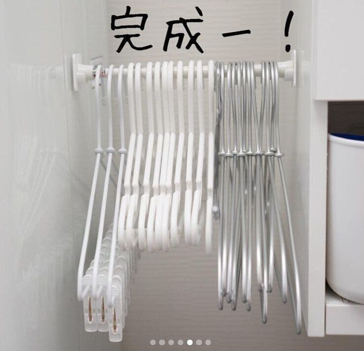 こちらは、セリアとキャンドゥのステンレスバーを使用したハンガー収納のアイデアです。脱衣所や洗濯機近くのスペースに取りつけると、洗濯物を干す際もストレスフリーに。吊るす収納はからまないのでうれしいです。