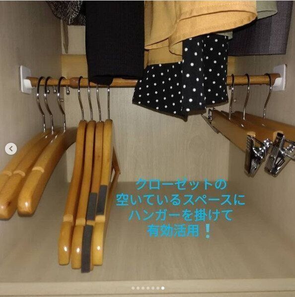 クローゼットの空いているスペースにつっぱり棒をプラスすれば余ったハンガーをかけておけるスペースに大変身。これならハンガー同士がからまることなく、使いたいときにさっと使うことが可能です。