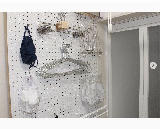 有孔ボードで狭い洗面所の壁面をハンガー収納に有効活用