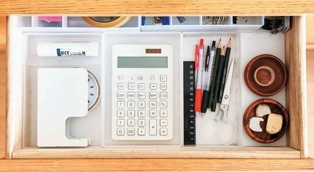 鉛筆、赤ペン、定規など種類が多い文房具は、細かく分けない代わりに、数量をしぼって収納。全体がひと目で見渡せる数なら、出し入れ時に迷いません。