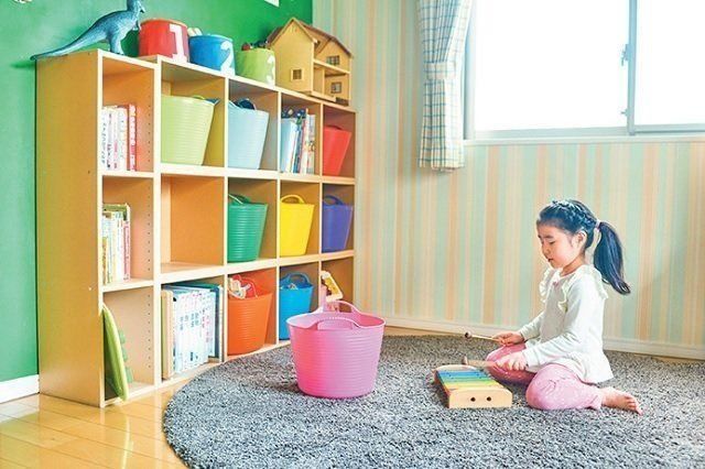 おもちゃは持ち手つきのバケツに種類別に収納し、使う分だけをリビングへ。カラーボックスに入る分だけと量を決めれば、おもちゃが増えすぎることもなくなります。