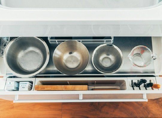サイズの違うボウルやざるを入れ子に重ねて収納するのをやめたら、出し入れがラクに。