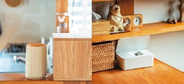 「ゴミが出る場所の近くに置けば、家族みんな自分で捨ててくれます」と、キッチンわきとダイニングテーブルにそれぞれ小さなゴミ箱を設置。テーブル上のものはウエットティッシュのケースを再利用。