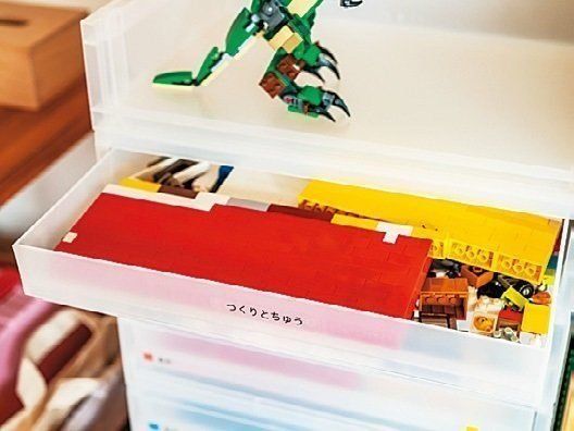 ブロックを片づける際に悩むのが、作りかけの子どもの「作品」。完成させるまで壊したがらないものですよね。途中の物専用の引き出しをつくってみたら、大切そうにしまっているので正解でした。