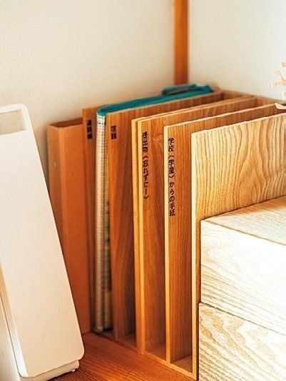 プリントや連絡帳は、ダイニングの近くにあるデスクのファイル立てが定位置。すぐ目に入るので、提出を忘れることもなく、不要な物はすぐ処分できます。長男は帰宅したら自分でここへ入れるという習慣もついているそう。