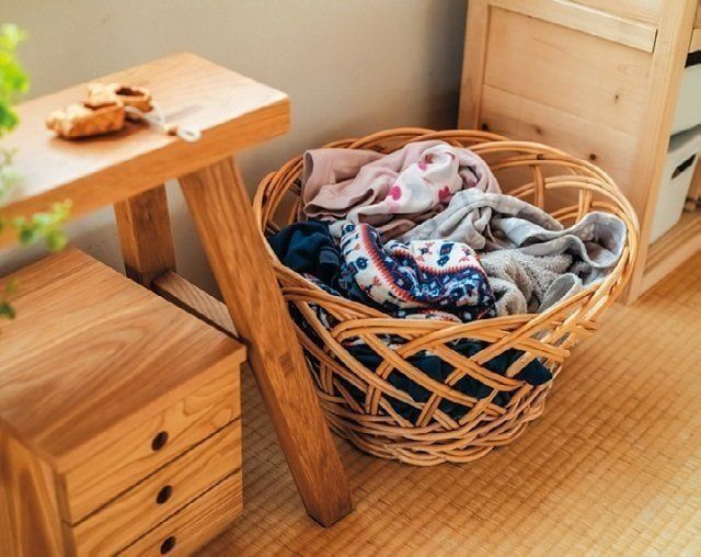 「脱いだらリビングに脱ぎっ放し」を防止するために、大きめのカゴを用意。いちいちたたんだりハンガーに掛けたりはせず、カゴへポンと放り込むだけなら、子どもでも一瞬で片づけられます。