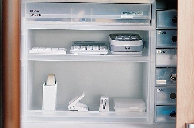 子どもがよく使う文房具は、引き出しには入れず、扉の中に〝むき出し〞に収納。「○○はどこ?」と聞かれることもなくなり、白で統一したら見た目もスッキリ。