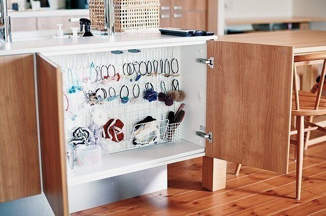 キッチン前面の扉の中に、100均のネットを使って子どもたちのヘアアクセをズラリ!毎晩、髪をほどいたらここへ戻すルールで、「お気に入りがない~(泣)」も防げます。