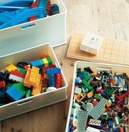 以前は子ども別に収納していたというおもちゃ。「結局一緒に遊んで交ざるので、片づけが大変」。〝だれのおもちゃでも箱に放り込むだけ〞に変えたら、片づけるのもラクで早い!