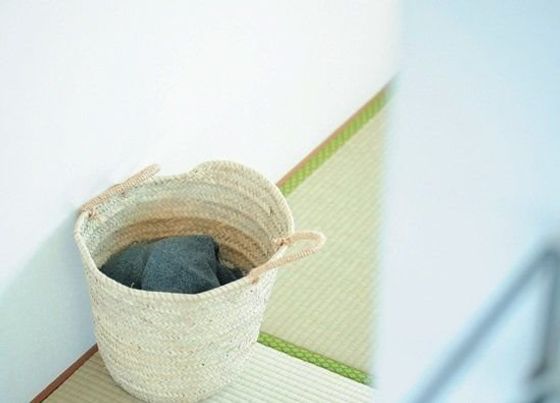 夫が服をいすにかけるので、放り込むだけのかごを近くに置いて解決。