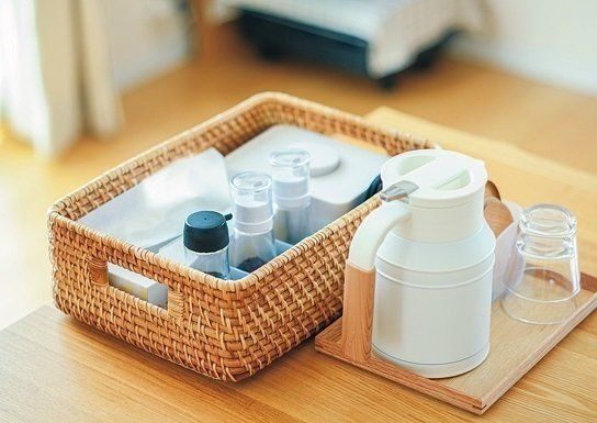 ▲しょうゆやティッシュなど、テーブルやカウンターに置きがちな物はかごにまとめましょう。セルフサービスならママの手間もグッと減ります