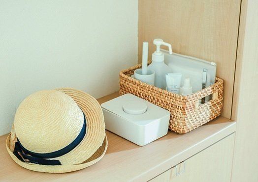 ▲日焼け止めや虫よけスプレー、マスク、園帽など、外出時に使う物は玄関にひとまとめ