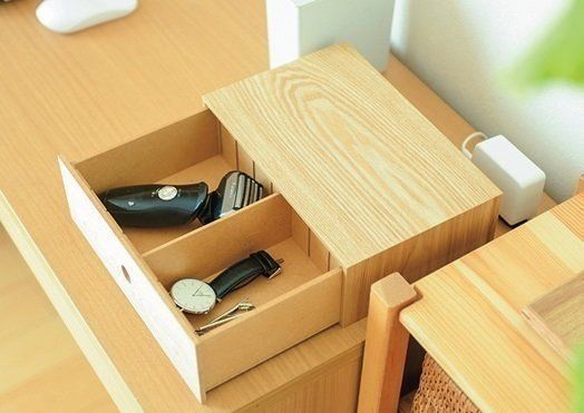 ▲夫はリビングの隅のテーブルのそばで朝の身支度をするから、ここをひげそりや腕時計、スマホやパソコンの充電器などの定位置に。「あれどこ?」と聞かれることがなくなりました