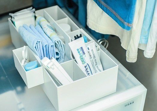 ▲園に持って行くハンカチやティッシュ、綿棒などのケア用品は、セットで収納。ふたなしBOXなら出し入れもラク