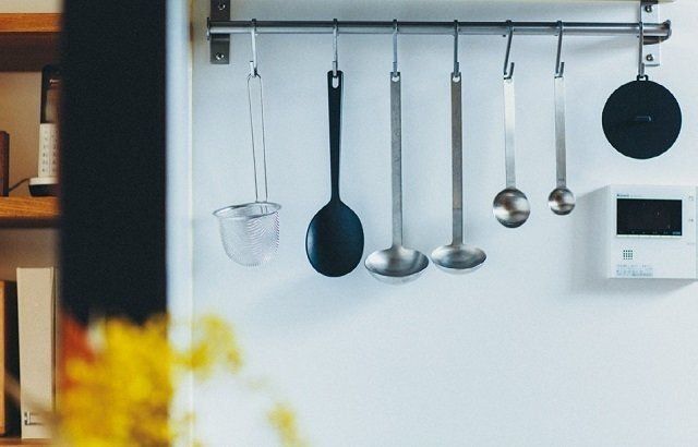 ほぼ毎回使う1軍のツール類はコンロ上を定位置に。使用頻度が1日1回以下の2軍の物は、振り向くとすぐ手が届く引き出しへ。さらに大さじ小さじは1本ずつなど、同じ物を重複して持たないようにしたら、自然と必要な物がすぐ手に取れるキッチンになりました。