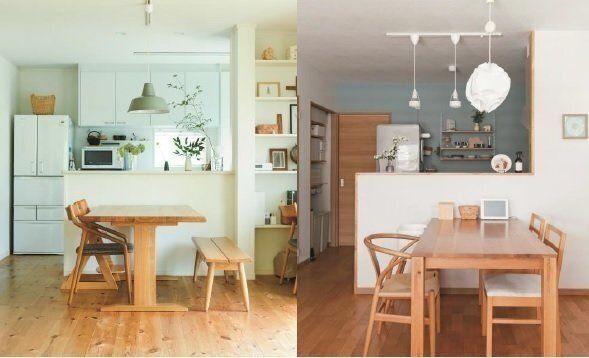 注目したいのは、どちらのお宅も腰より少し高めの壁によって、キッチンの水栓やシンクは、ダイニング側から見えないということ。また、右手には天井まである間仕切り壁を設けて、コンロまわりは外側からまったく見えないようにしています。