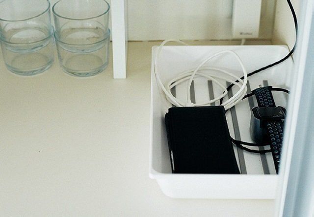 スマホの充電中はコンセントまわりが雑然としがち。トレーにまとめればスッキリと片づいて見えます。このトレーなら、底と内側に滑り止めがついているのでずれにくく、コードもからみにくい。