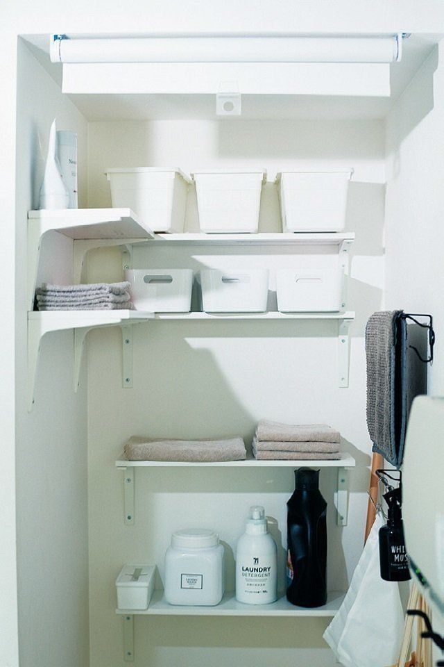 うまく使いこなせなかった洗面所の収納スペースをDIYで模様替え。棚板とブラケットを使って壁面に棚を取りつけ、収納ボックスをセットします。最上段はほこりが入らないよう、ふたつきのボックスをチョイス。急な来客問題は「ローラーブラインド」を使えばサッと目隠しができます。手軽に取りつけられ、特殊コーティングで光を通さないから、中が透けて見えることもありません。