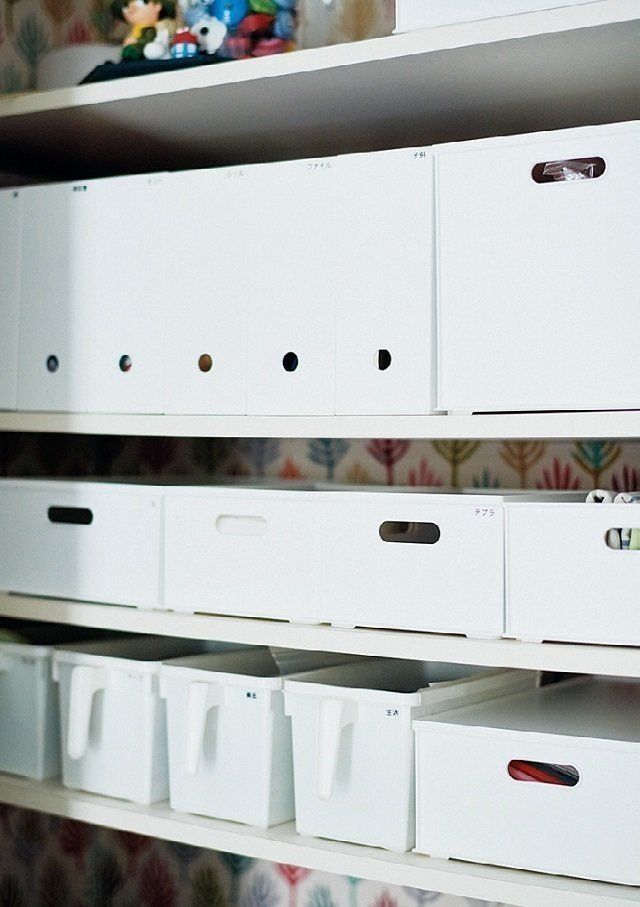 キッチンの奥に設けたパントリーには、書類や日用品を一括収納。しまう物は1ケースに1種類だけと決めておけば、探す手間もいりません。棚の高さに合わせてケースを選ぶのもポイントです。