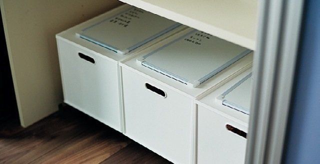 食材の収納はふたができるBOXがおすすめ。「ふたがないとどんどん詰め込んで、同じ物を二重買いすることも。ホワイトボードに今ある物を書いておけば、在庫管理がラク」