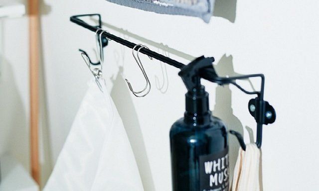 壁面にタオルレールを取りつけて、デッドスペースを有効活用。スプレーボトルを引っ掛けたり、ワイヤークリップを使えば生乾きの洗濯ネットをつり下げて乾かすこともできます。
