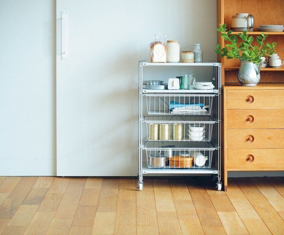 スペースや用途に合わせて自由に組み合わせができるユニットシェルフ。なかでも特に人気なのが、このワゴンセット。シンプルで機能的なデザインは、機動力も抜群。キッチンで使えば家事効率もUPしそう。