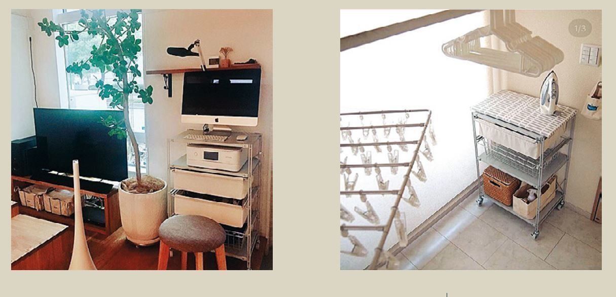 (写真左)パソコンやプリンターがコンパクトに収納できて、見た目も◎。バスケットをワイヤーから帆布に変更すれば、中身が見えないので安心(mozu_1123さん)