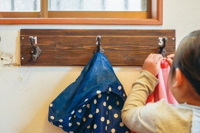 「脱いだ上着をそのまま放置」を防ぐフックを玄関に。「子どもに合わせて低めの高さにして、1人1つずつ、上の子から順に番号をつけたら、自分から上着を掛けてくれるようになりました」