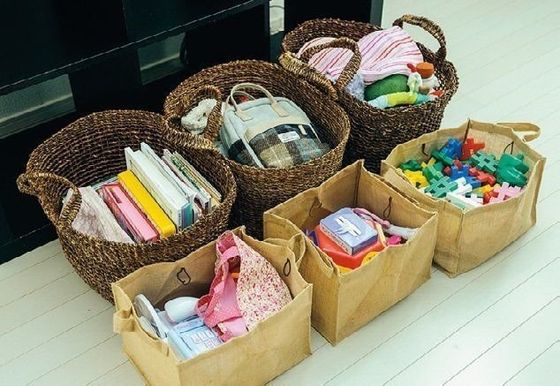 小さな子どもでも出し入れしやすくて中身がわかりやすい、口の広いかごを選んでいるのがいいですね!ママのやさしさが伝わります。