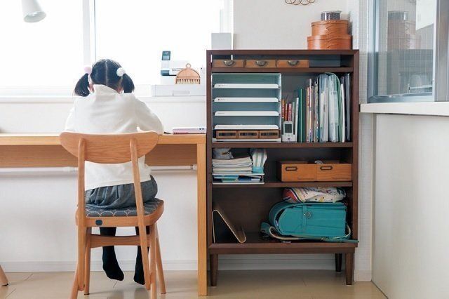 いつもあちこちに置きっ放しにするランドセルを、子ども部屋まで持っていかせるのはかなり困難。リビング隅に教科書や身支度グッズもまとめておける専用コーナーをつくると、喜んで片づけるように。
