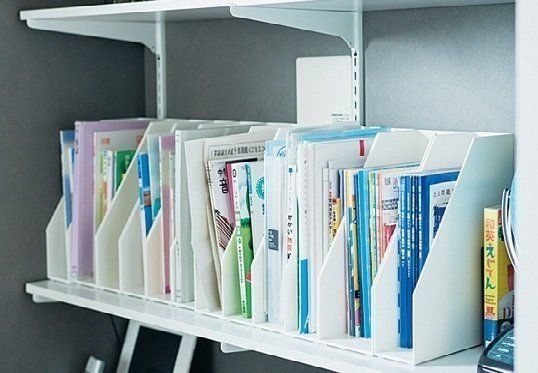 中学生になって副教材が増えたので、書類ボックスで科目ごとに分けてしまえる仕組みに。それぞれの分量に合う幅7cmで、手前からスッと取り出せる立ち上がりのない物を探しました。