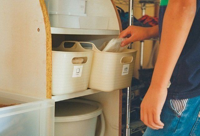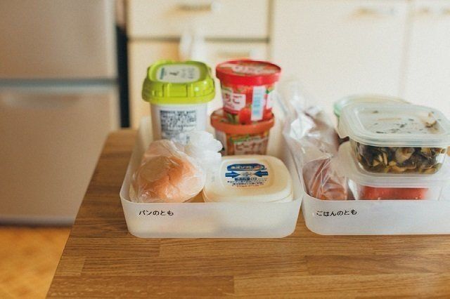 留守の間に子どもたちが自分でごはんを準備して食べることも。パンやジャム、梅干しや漬けものなどの食材は、チーム分けをしてケースにまとめておくとサッと出せます。