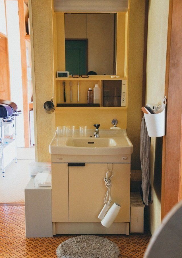 石けんや歯ブラシなど、ヌメリの原因になる物は、洗面台にじか置きしないルールで掃除の手間を極力減らしています。それをよく使う場所につるすと出し入れがしやすく、時短&省スペースに。