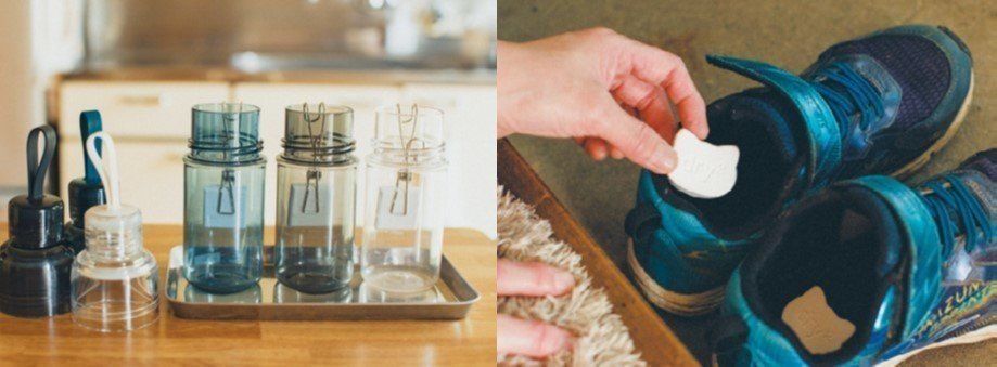 吸水性に優れた珪藻土ブロックは、靴の湿気を取ったり、水筒を乾燥させるのに重宝。フックつきピンチにはさんで水筒の縁に引っ掛けると◎。めむさんはキャンドゥなどで小さめサイズを購入しています。