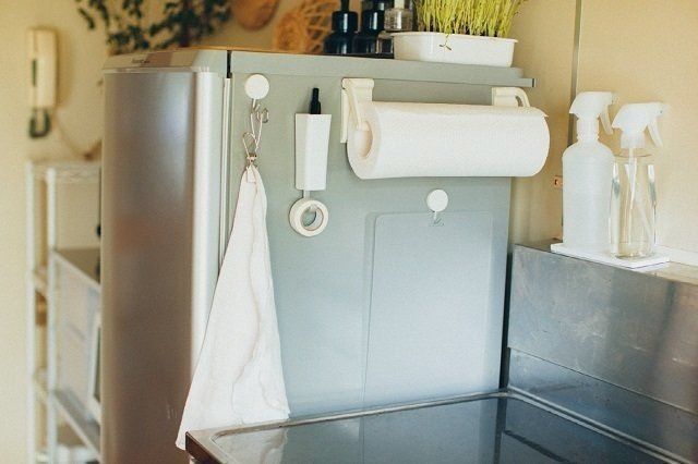 【6】冷蔵庫×マグネットフックで、よく使う物を壁面にずらり