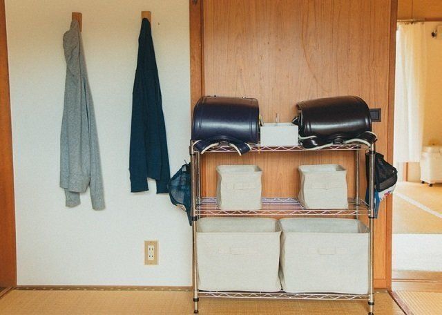 ワイヤーラックを2人のランドセルや学用品の指定席に。最上段は無印良品の収納キャリーボックスで仕切りを。学校への提出物は、ママがチェック後ここに入れると忘れません。