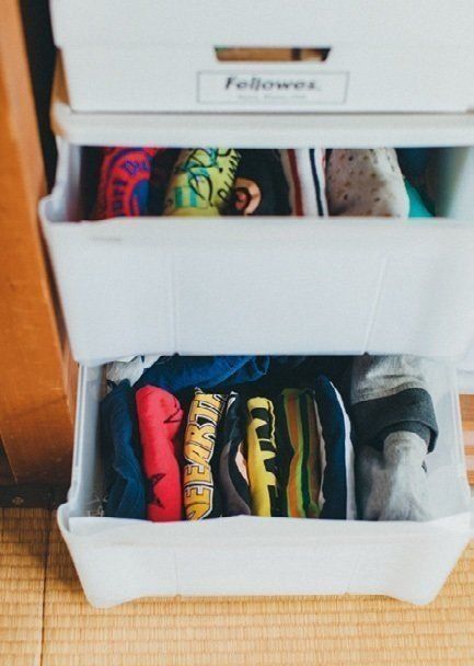 子ども服は「1人につき引き出し1段分」と決めています。今年も着るか迷ったら一度着せてみて、サイズが合わなければ即処分。立ててしまうと子どもたちも選びやすくて◎。