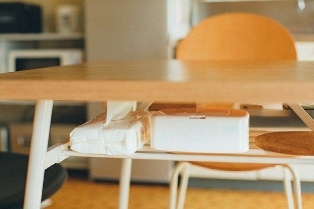 棚つきのテーブルは、ネットショップで探して購入。「ウエットティッシュやふりかけのほか、子どもたちが遊ぶトランプなどもしまえるので、テーブル上はいつもスッキリしています」