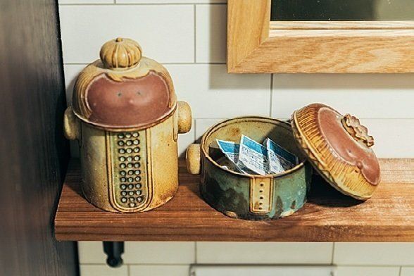 洗面所にある陶器の人形は、コンタクトレンズ入れ。もっと使い勝手のよい収納グッズはあるけれど、度数の違う「右」と「左」を分けられればいいので、心から好きな物を使用中。